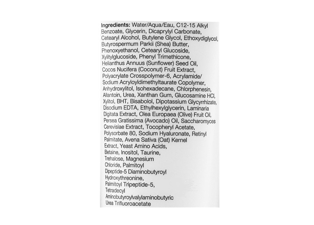 Water (Aqua), C12-15 Alkyl Benzoate, Caprylic/Capric Triglyceride, Glycerin, Helianthus Annuus (Sunflower) Seed Oil, Butylene Glycol, Glyceryl Stearate, Glyceryl Behenate/Eicosadioate, Dicaprylyl Carbonate, Butyrospermum Parkii (Shea Butter), Cetearyl Alcohol, Myristyl Myristate, Cetyl Alcohol, Ethoxydiglycol, Phenyl Trimethicone, Stearic Acid, Avena Sativa (Oat) Kernel Extract, Yeast Extract (Faex), Algae Extract, Glycine Soja (Soybean) Sterols, Zea Mays (Corn) Starch, Olea Europaea (Olive) Fruit Oil, Persea Gratissima (Avocado) Oil, Sodium Hyaluronate, Dipotassium Glycyrrhizate, Tetrahexyldecyl Ascorbate, Tocopheryl Acetate, Linoleic Acid, Phospholipids, Polysorbate 60, Acrylamide/Sodium Acryloyldimethyltaurate Copolymer, Isohexadecane, Glyceryl Polymethacrylate, Panthenol, Jojoba Alcohol, Potassium Jojobate, Polysorbate 80, Urea, Glucosamine HCl, PEG-8, Bisabolol, Sorbitan Oleate, Cetearyl Methicone, Dimethicone, Palmitoyl Oligopeptide, Retinyl Palmitate, Allantoin, Xanthan Gum, Disodium EDTA, BHT, Ethylhexylglycerin, Chlorphenesin, Phenoxyethanol.
